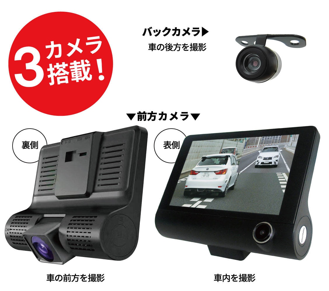 ドライブレコーダー 3カメラ同時録画 フルハイビジョン (フロント/車内/リア) [CART3-1080P]