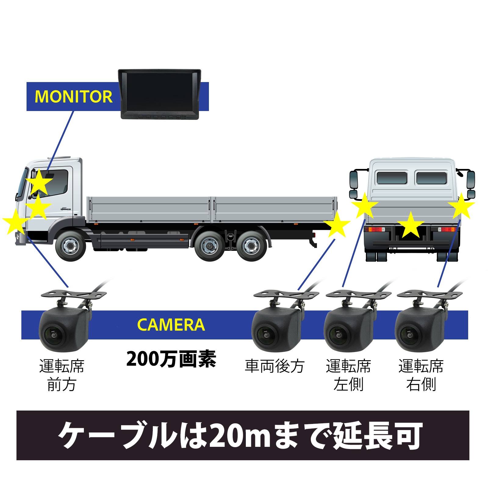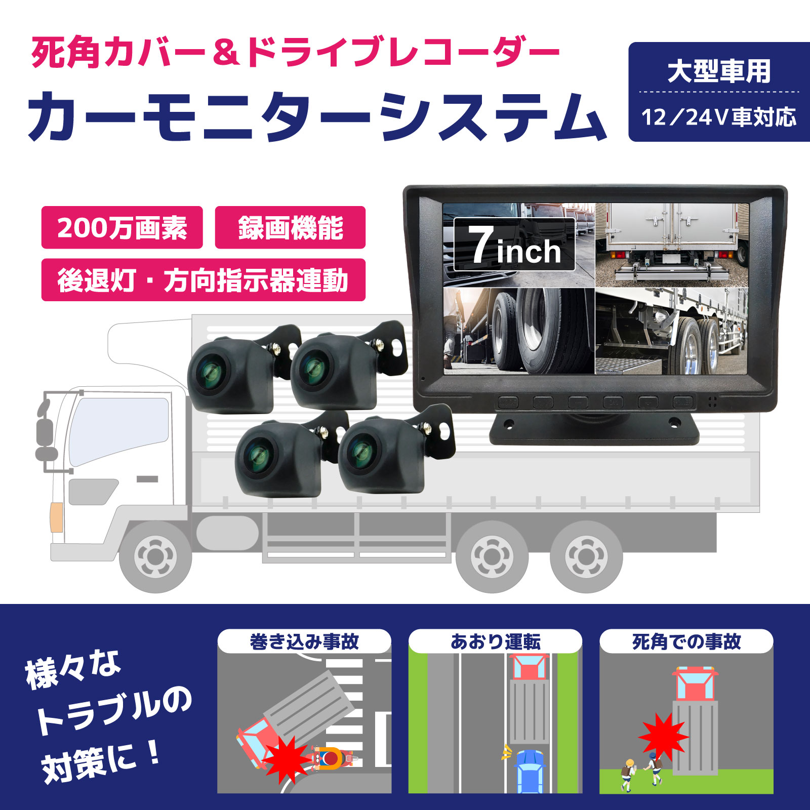 360度監視 200万画素カメラ2台 7インチモニターセット(録画機能付き) [CAR-S-360-2B]