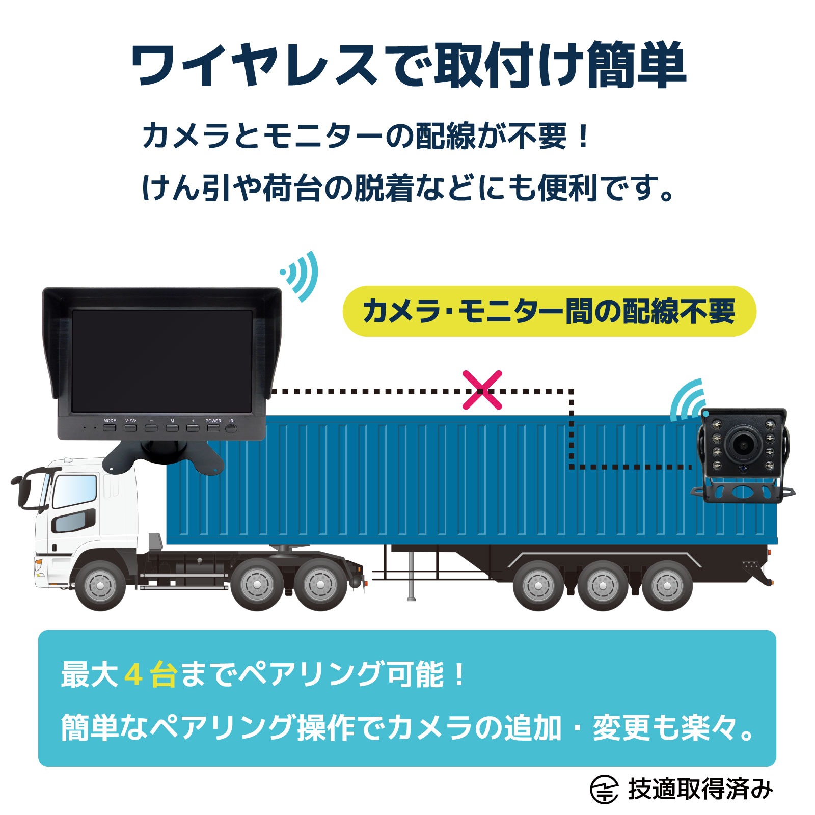 ワイヤレスカメラセット 人検知AI付200万画素 7インチモニター 大型車用(カメラ1台) [CAR-S-W-1CH]