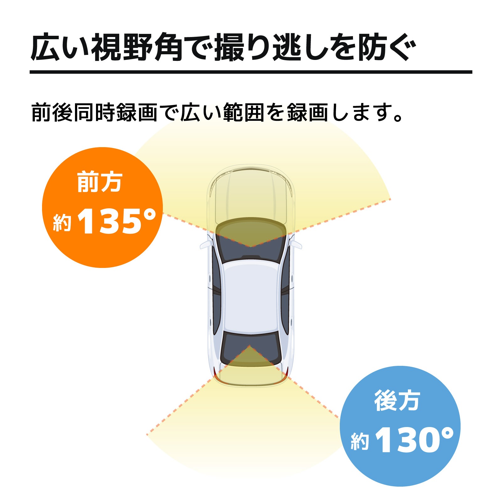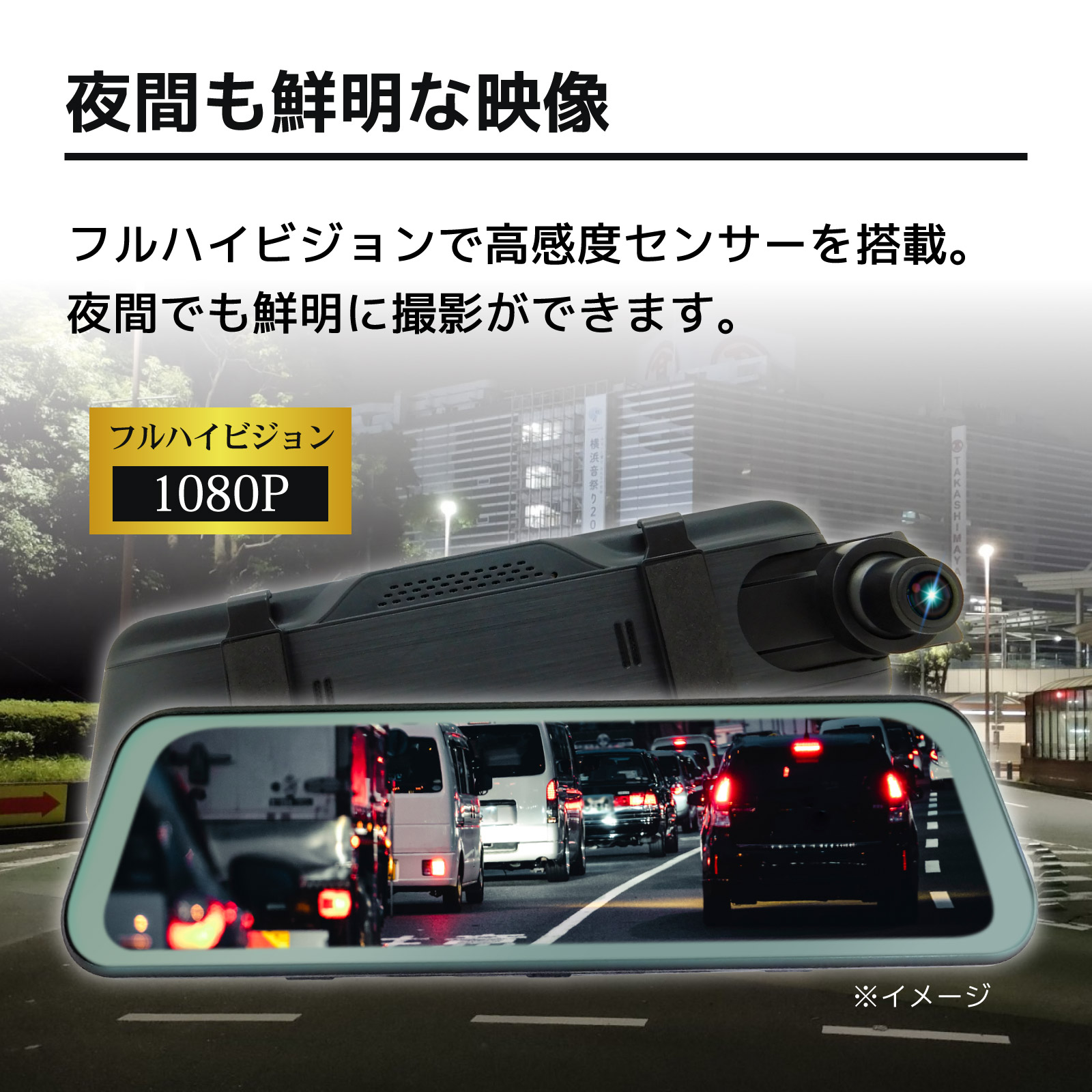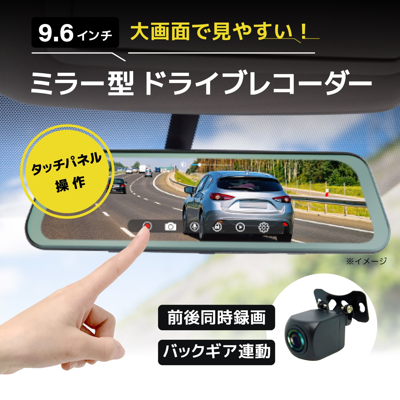 ・9.6インチ大画面ミラー型ドライブレコーダー・タッチパネル操作・フルハイビジョン高感度センサー・夜間での撮影も可能・画角 前方135° 後方130°