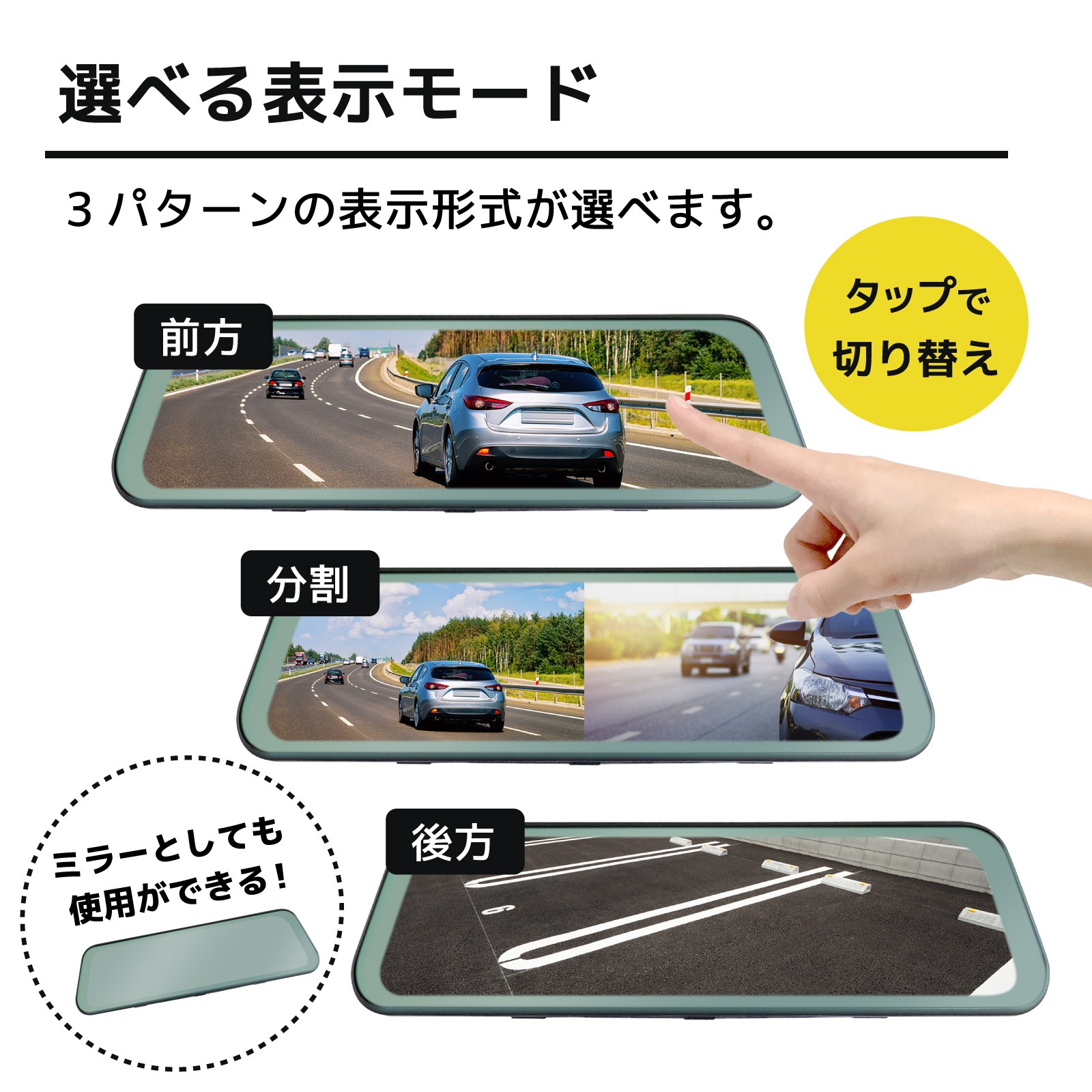 フルハイビジョン・ミラー型・前後カメラ・Gセンサー・タッチパネル式 ・見やすい9.6インチのドライブレコーダー。 【簡単取付ルームミラー取付型の9.6インチモニター】 【表示モードは3パターン】 【駐車監視・Gセンサー機能搭載・その他機能】 【バックカメラケーブルは6m】