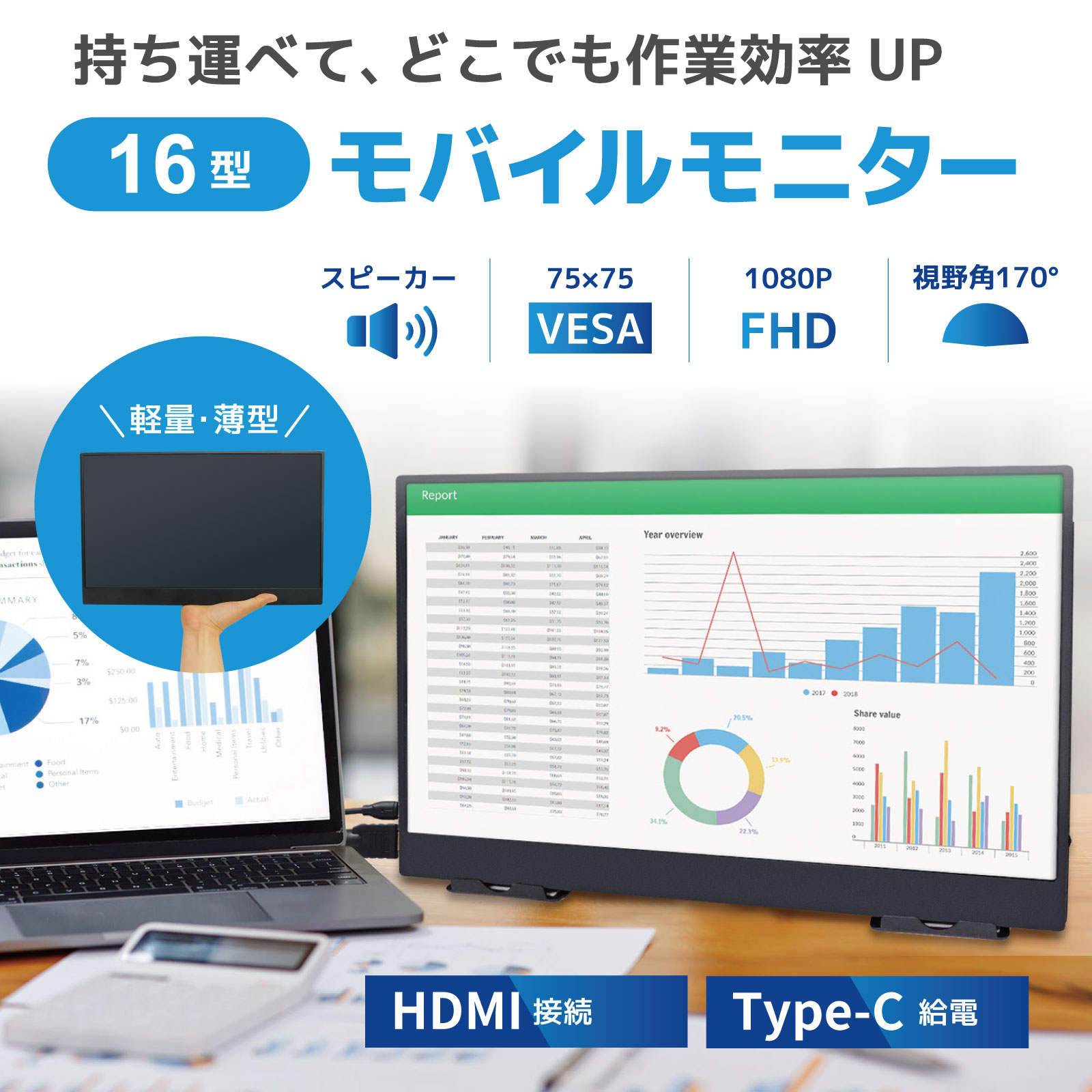 13.3インチ液晶モバイルモニター 200万画素 スピーカー内蔵 [LCD-H133]