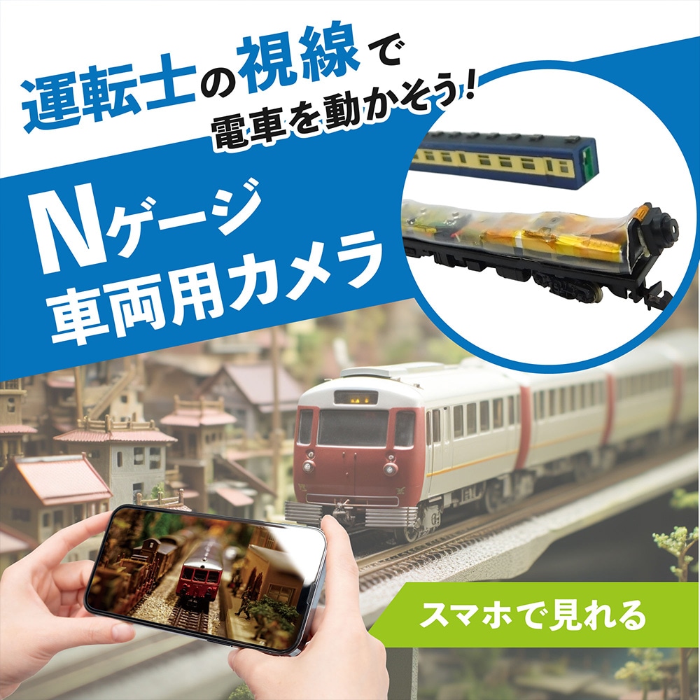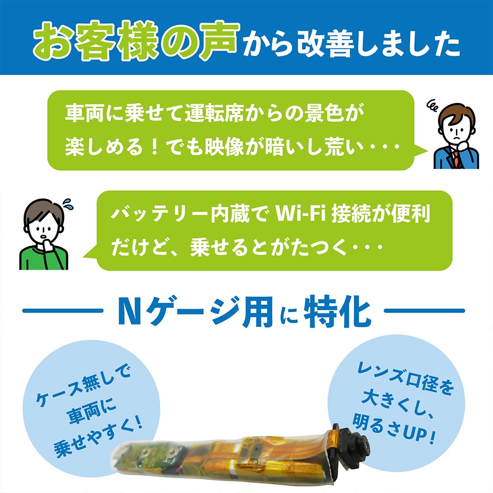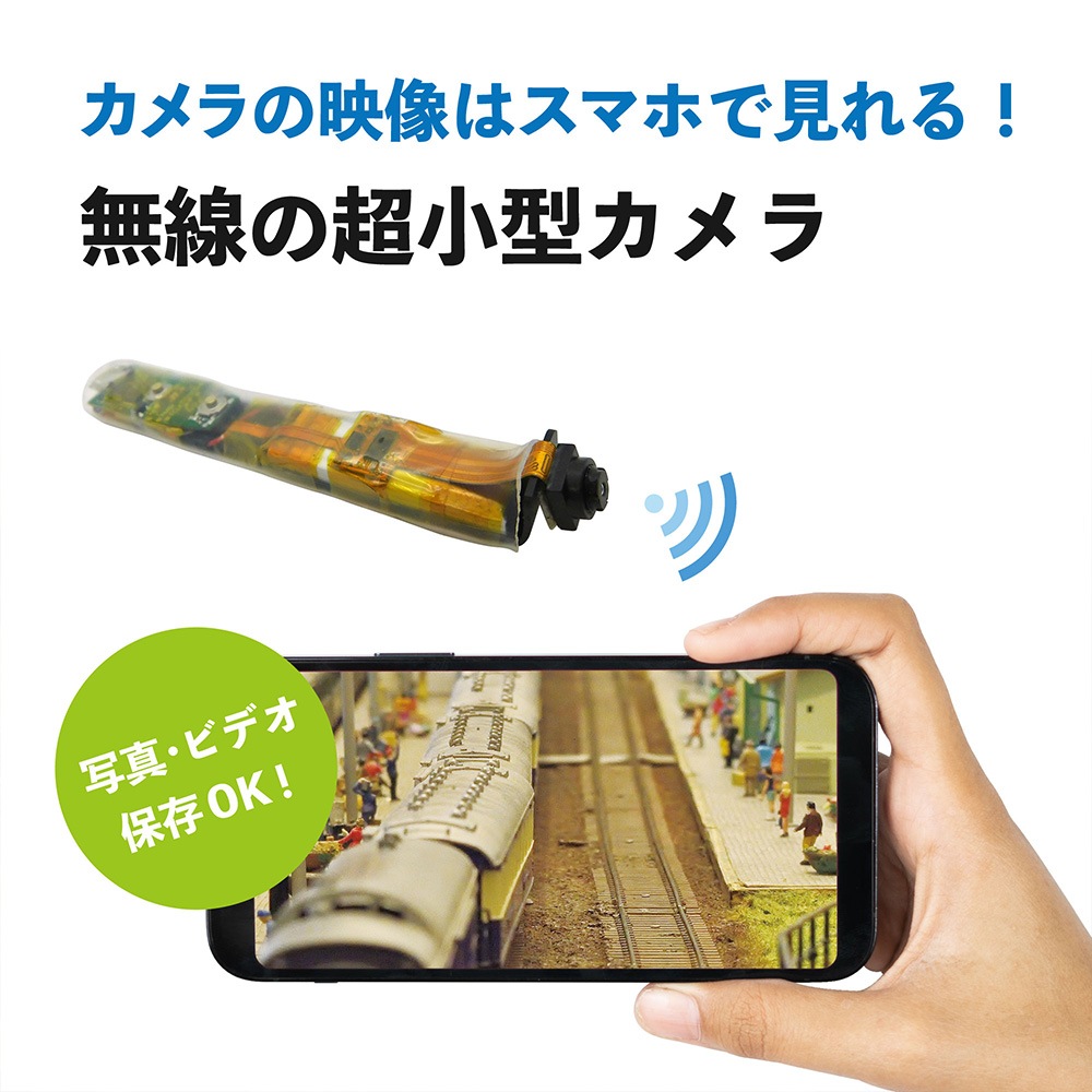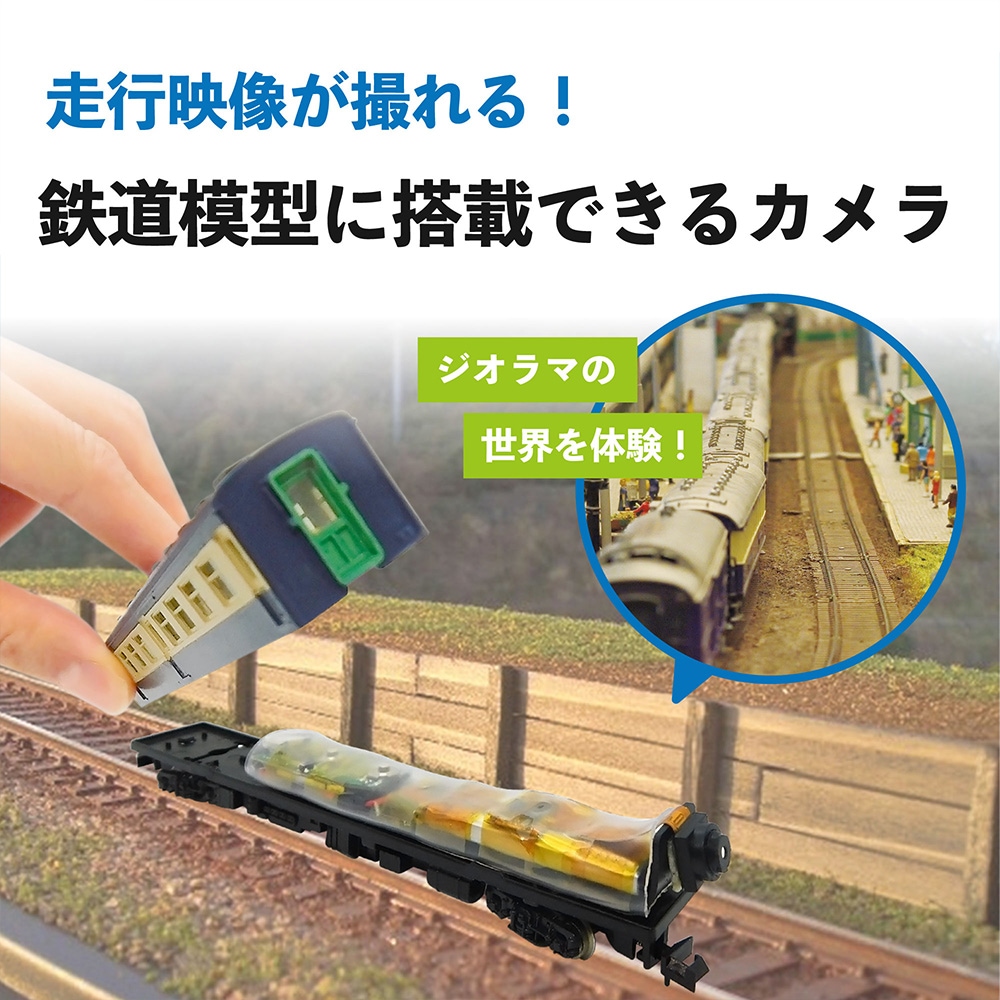 Nゲージ搭載専用カメラ!従来のカメラから外装をのぞいてNゲージにすっぽり入るサイズとなっています。 【従来カメラより進化】画素数は200万画素、撮影画角は80°で、従来品より映像の明るさはアップ。 【Nゲージの走行映像を撮影】超小型カメラで配線不要なのでNゲージだけではなく、ジオラマ、プラモデル、ラジコンなど小さなものの上に貼り付けて撮影できます。特に動くものにつけて撮影してSNSにアップすれば臨場感間違いなしで、投稿内容の幅が広がります。 【配線不要・取付簡単超小型カメラ】ボールペンと同じ重さの約10gと超軽量。Nゲージに乗せても負担になりません。こんなに軽くてもバッテリーを内蔵しているため、電源不要で使用できます。 【Wifi接続でアプリ連携】無料の専用アプリがあり、ワイヤレス接続を利用して映像をスマホのアプリに送信して撮影することができます。アプリからは動画撮影のスタート、ストップ、写真撮影などができ、撮影チャンスを逃しません。
