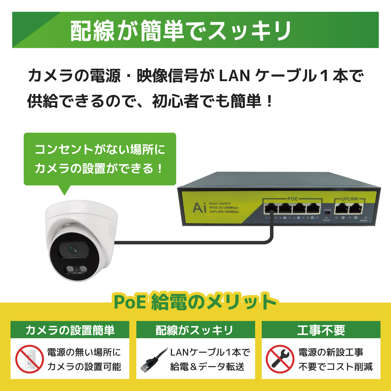 LANケーブル経由で電気を供給するため、電源をとれない場所にもカメラを設置できます。