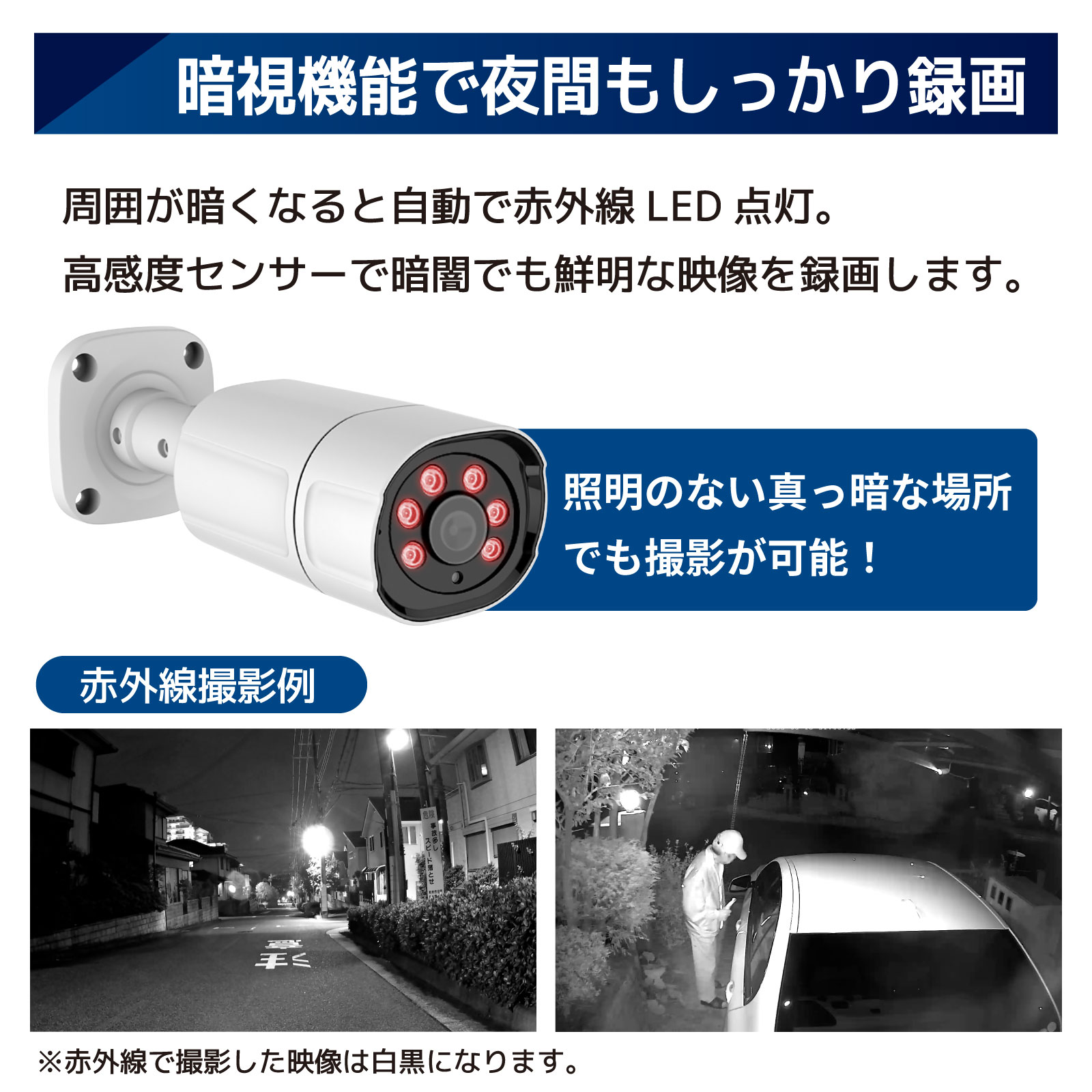 赤外線LED搭載で夜間撮影も可能。(モノクロ撮影)