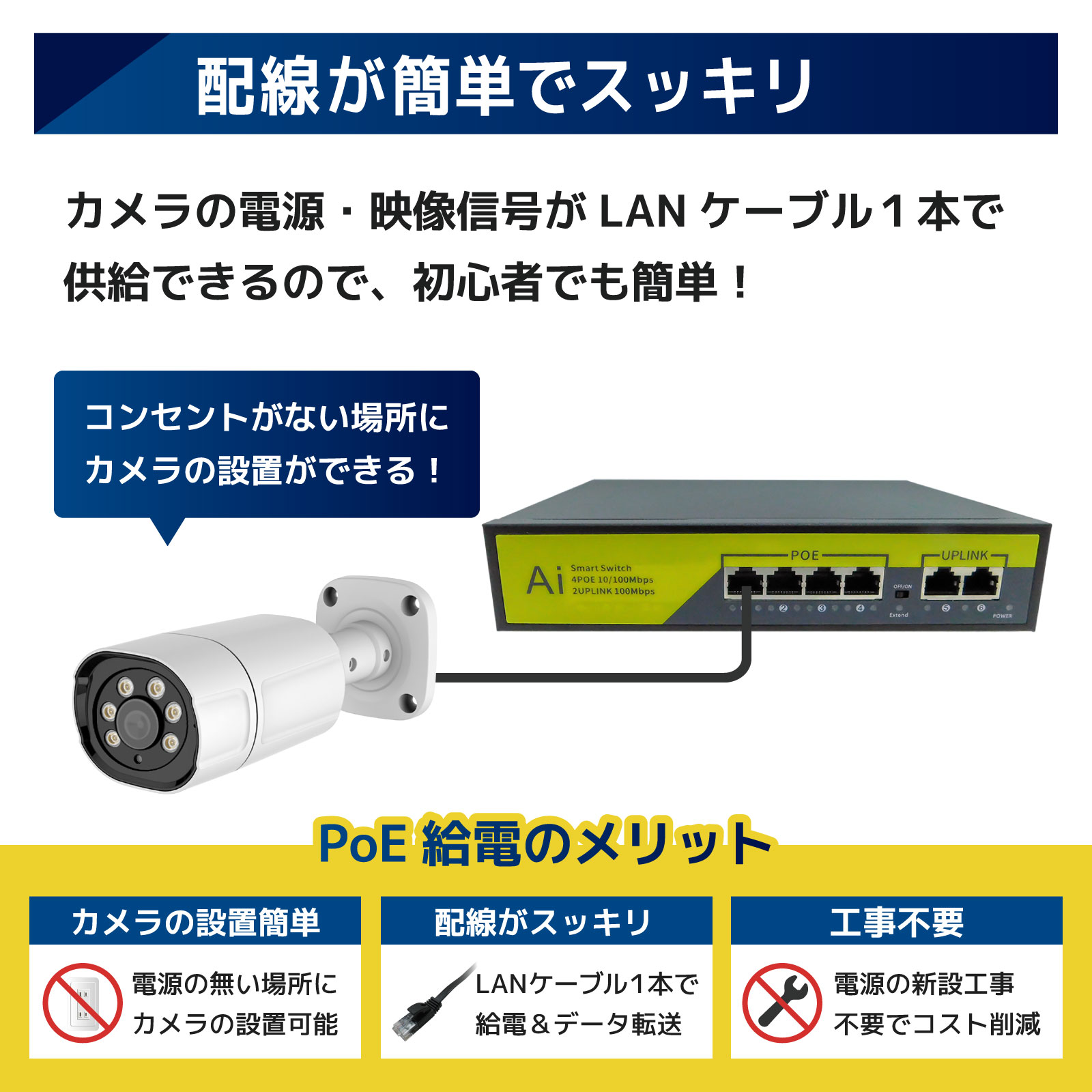 LANケーブル経由で電気を供給するため、電源をとれない場所にもカメラを設置できます。