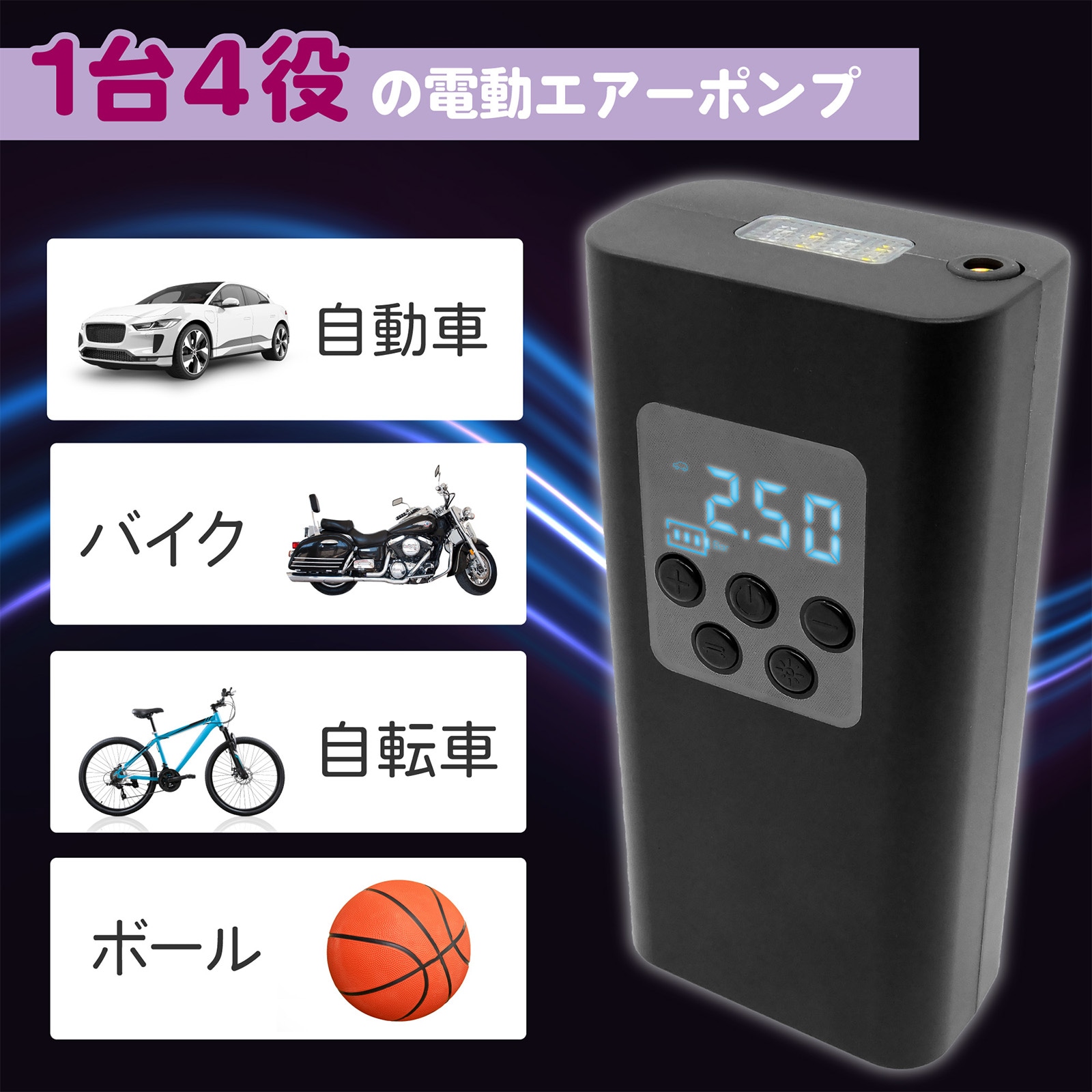 【タイヤ圧の測定&自動停止機能】タイヤ圧の測定機能付きなので、お客様が設定した圧力まで自動で空気を入れることができます。空気入れは自動で停止するので空気を入れすぎることなく、安 心してご使用いただけます。自動車、オートバイ、自転車など多くの車種でご使用いただけます。高圧力なので、ロードバイクなどにもご使用いただけます。他にもうきわやボールなど趣味やレクリエーションなどにご使用する空気入りのおもちゃにも対応してます。