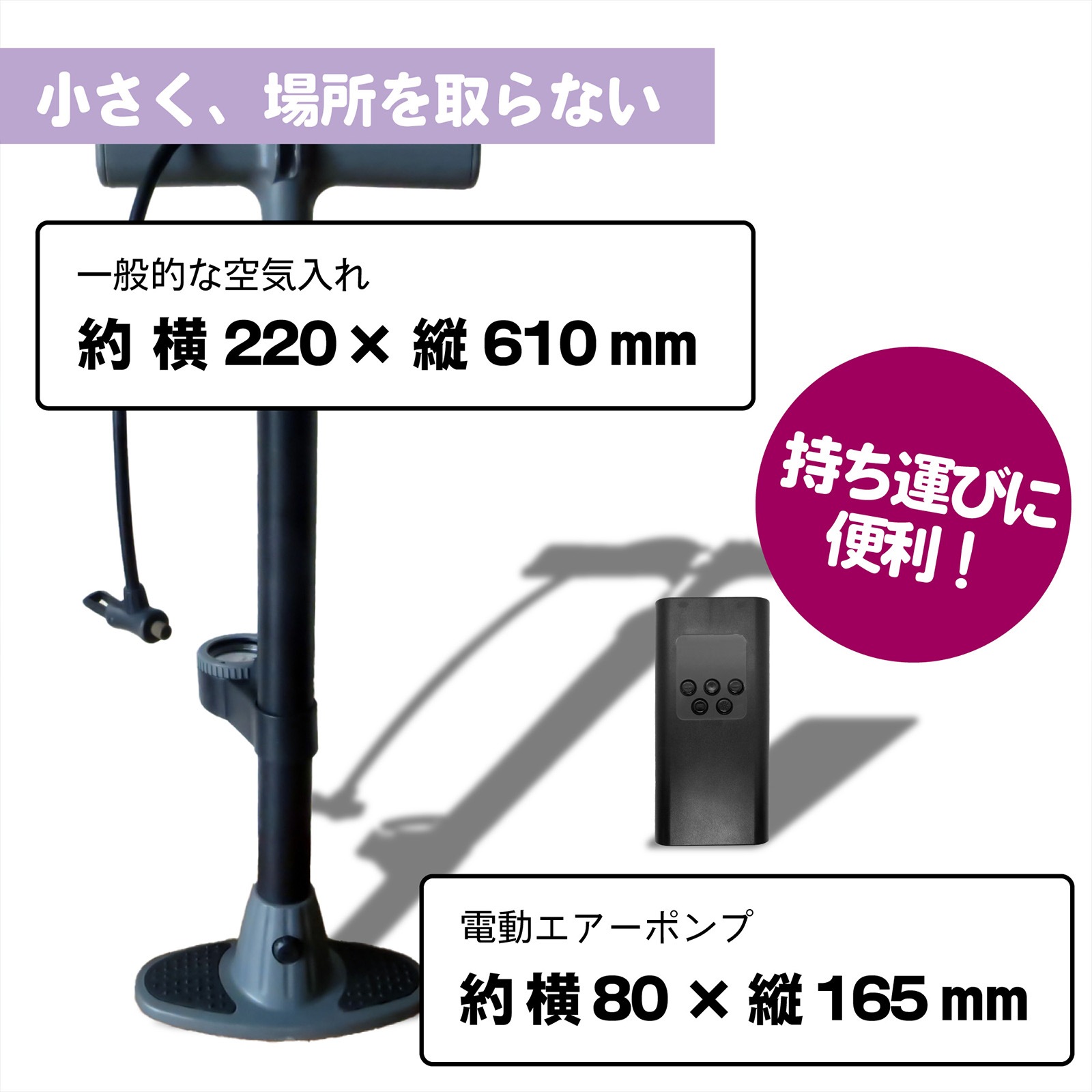 【仕様】サイズ:約16.5×約8×約4.8センチ、重さ:約440g、付属品:エアーホース、バルブアクセサリー、USB充電ケーブル(ACアダプタは別売りになります)、収納袋